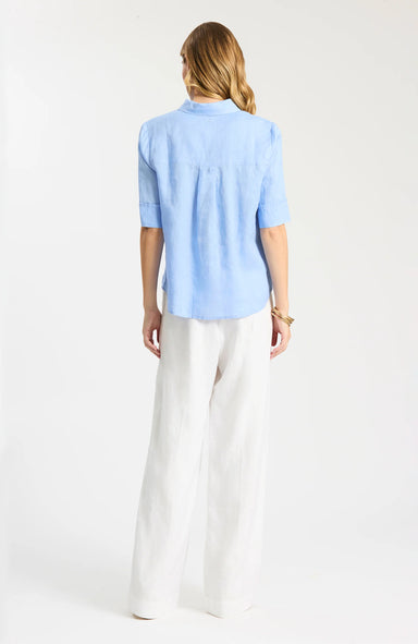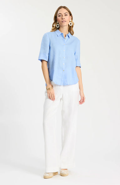 Point collar Button-front closure Short sleeves with a wide cuff 100% Linen Machine wash cold, line dry