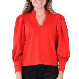 A vibrant twist on a NAVYBLEU favorite. The Westport Top in red features a ruffled stand collar, puffed sleeves, and just the right amount of polis...
