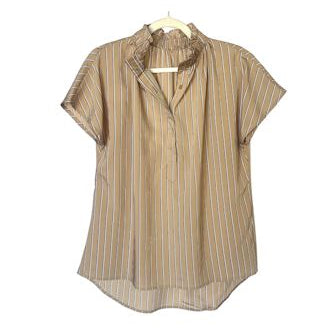 The Caryn Lawn Emily Top in Khaki Stripe features a delicate ruffle collar and elegant cap sleeves, offering a refined and feminine silhouette. Cra...