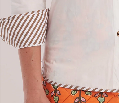 The Bryson Button Down in White/Taupe Stripe puts a playful spin on a classic look. Featuring clean, crisp white fabric with gold buttons and peek...