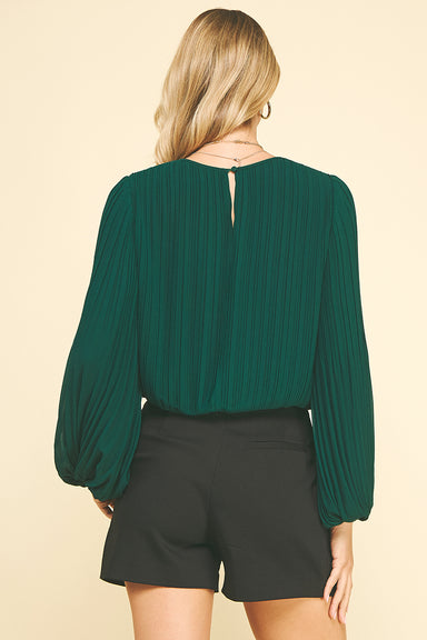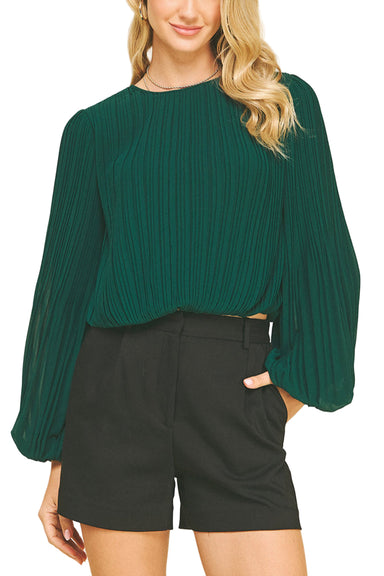 This pine green long sleeve top features elegant pleated fabric and bishop sleeves that add effortless sophistication. Designed with a round neckli...