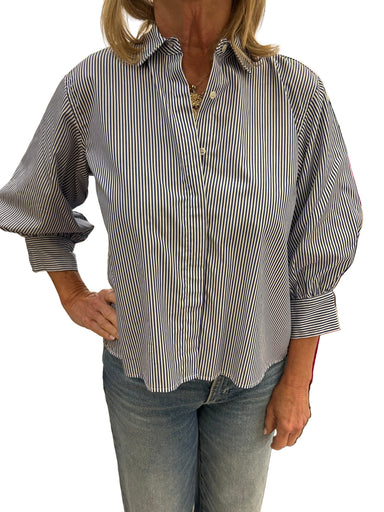 The Britt Top in Truffle Stripe is a tailored standout, designed with elastic puff sleeves, a classic fold collar, and a button front with a sleek ...