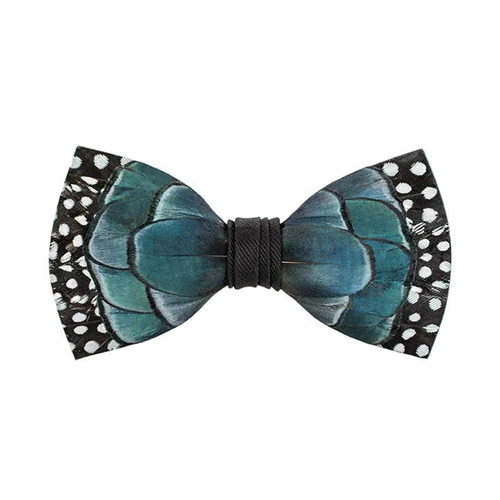 The Green Pond is a muted, iridescent blue-green bow tie with black and white edges. A little bit chic, a little bit classic, we spotlight subtle pheasant feathers with our trademark guinea feather outline.