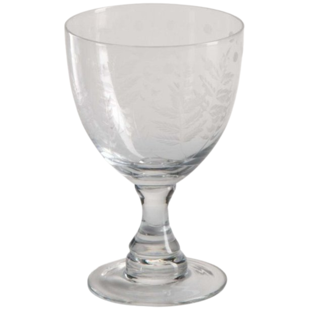 With beautifully etched fern fronds and a lively border of small dots, this glass has a timeless beauty that straddles vintage and modern.