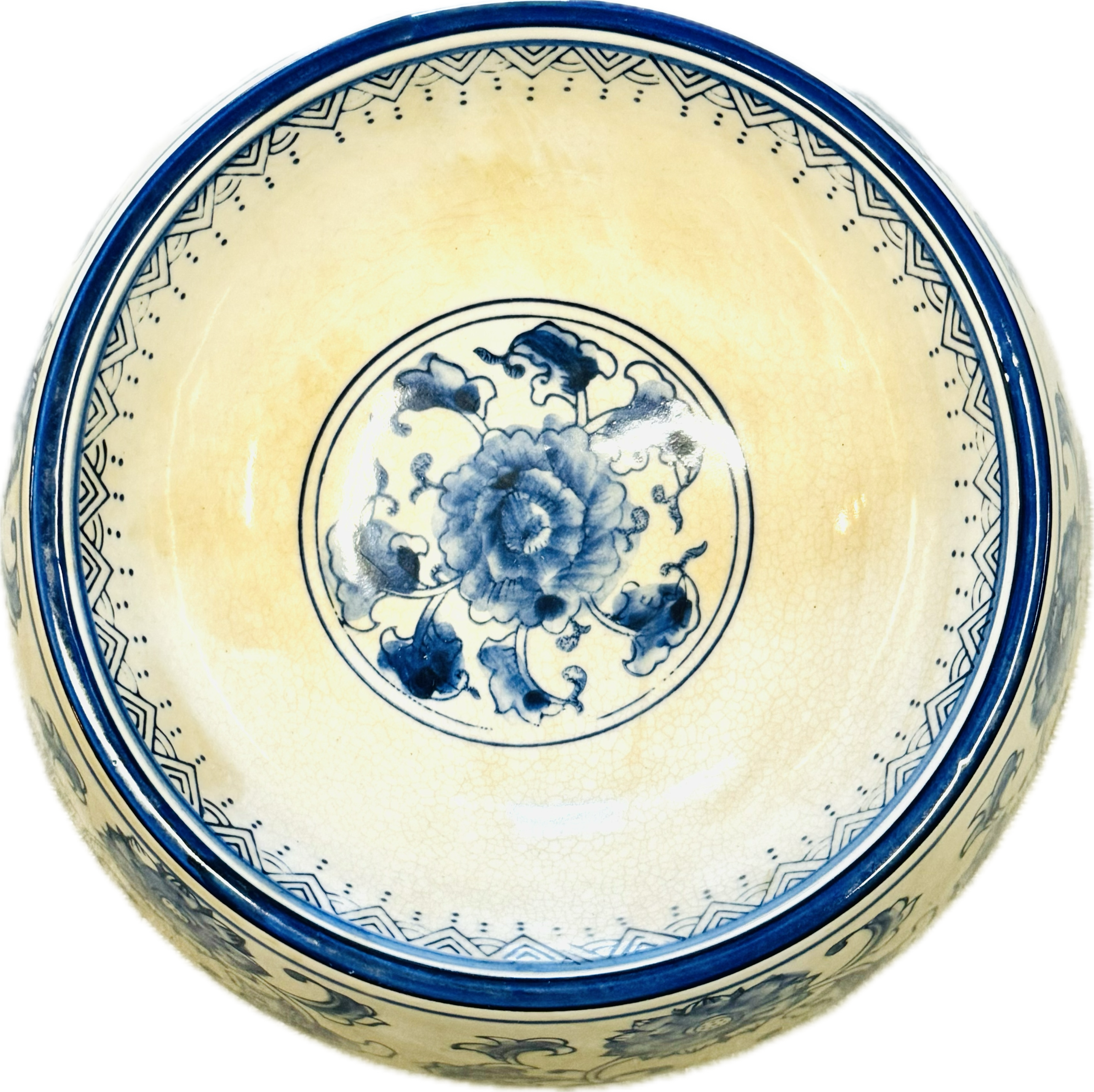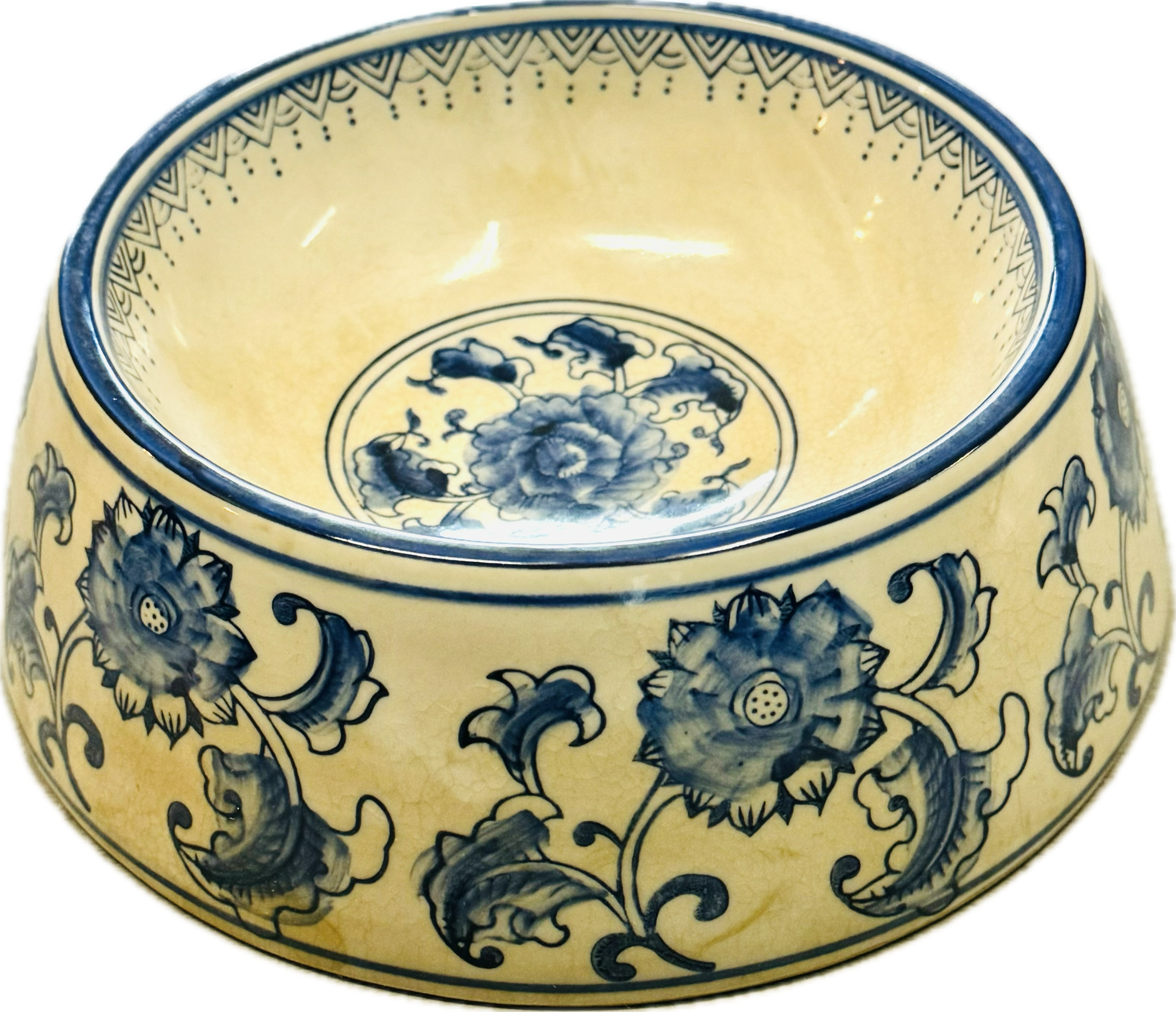 This lovely porcelain dog bowl features a classic blue and white pattern making it a perfect addition to any elegant home.