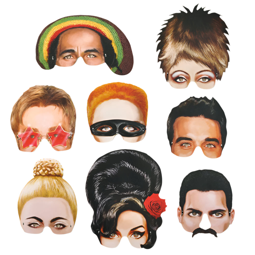 A fantastic die-cut and embossed half-face masks depicting a range of music legends: Tina Turner, Robbie Williams, Amy Winehouse, Freddie Mercury, Madonna, Elton John, Bob Marley and Annie Lennox, all of which are also available to purchase individually. Perfect for fancy dress, dinner parties and theatrical performances. All masks arrive strung and ready to wear.