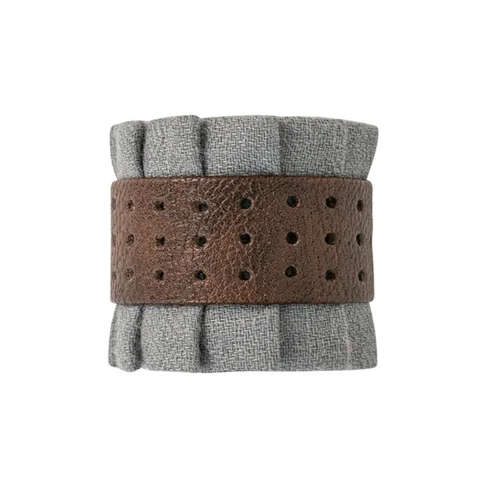 Ruffled wool is gorgeously gathered with a cinching of espresso-hued leather for a look that is as richly textural as it gets. Especially handsome when paired with our holiday collections for an elegant finishing touch!