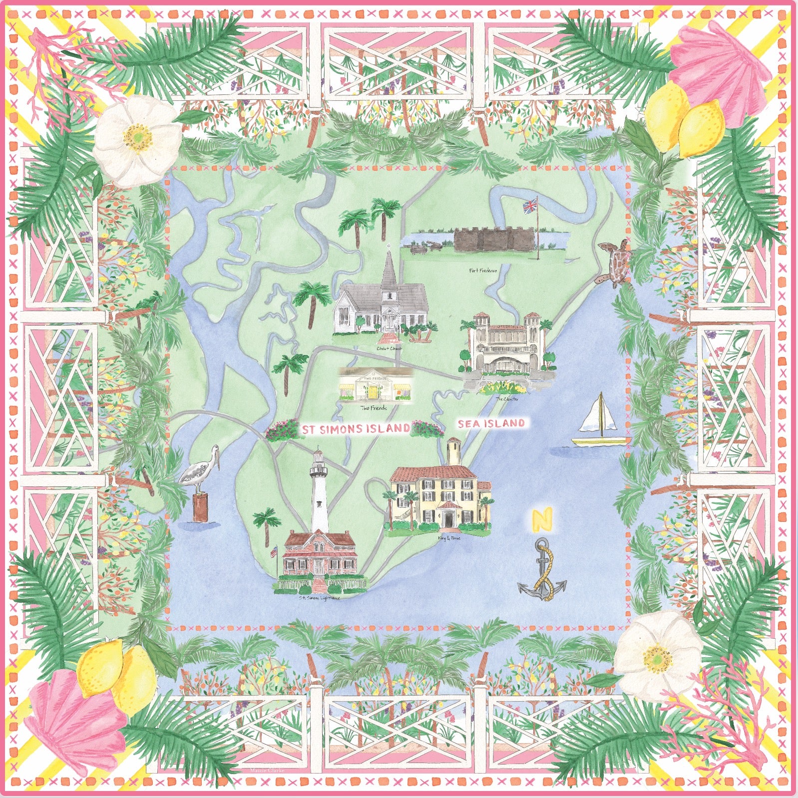 This 54"x54" cotton sarong by renowned Kentucky artist Maizie Clark, offers a custom design of our local area and all of our rich history for that discerning customer who loves The Golden Isles as much as we do! A perfect gift for yourself or your favorite beach buddy!