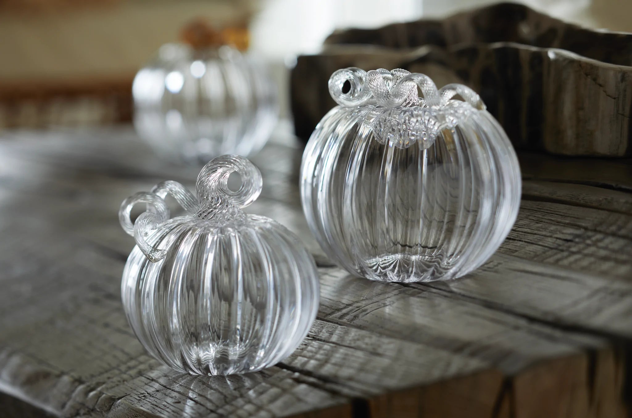 Add elegant opulence to your fall tablescape with an individually handcrafted glass Heirloom Pumpkin. This classic seasonal accent is interpreted in Clear with a Clear stem, measures 4.5" in diameter and is available in a combination of colors! Fine art glass designer, James McLeod's seasonal additions to the Mariposa custom Studio Glass Collection are hand blown right here on Boston's North Shore --- a perfect marriage of art and fine craftsmanship! Select complementary sizes and colors for a pretty pumpkin palette for your fall dining and décor.