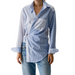 Relaxed fit, front single pocket, two knife pleats at back yoke. Signature contrast pink buttons, and navy contrast buttonhole details that serve as a wrapping template.