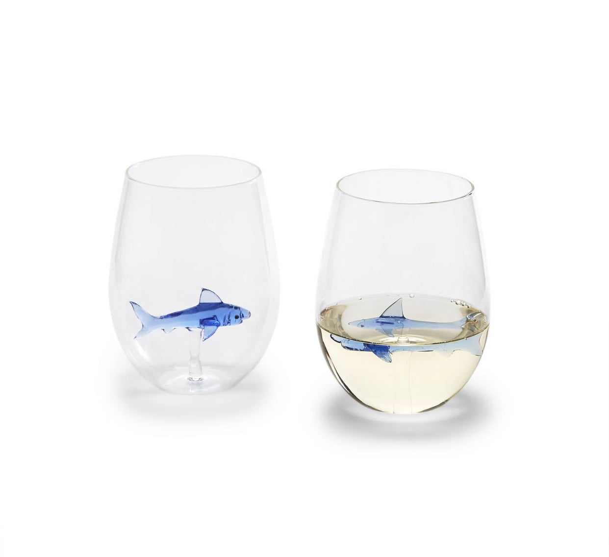 These hand blown glass is accented with a blue shark inside to swim in your beverage! A perfect pairing to any beach day.
