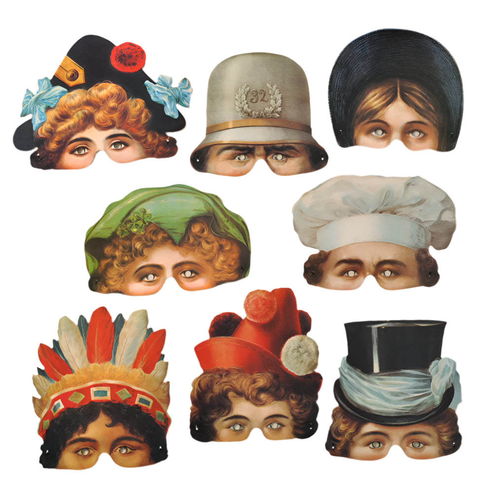 Eight attractive Victorian reproduction masks from the Speilzeug museum in Nurnberg – great for parties and theatrical performances alike.
